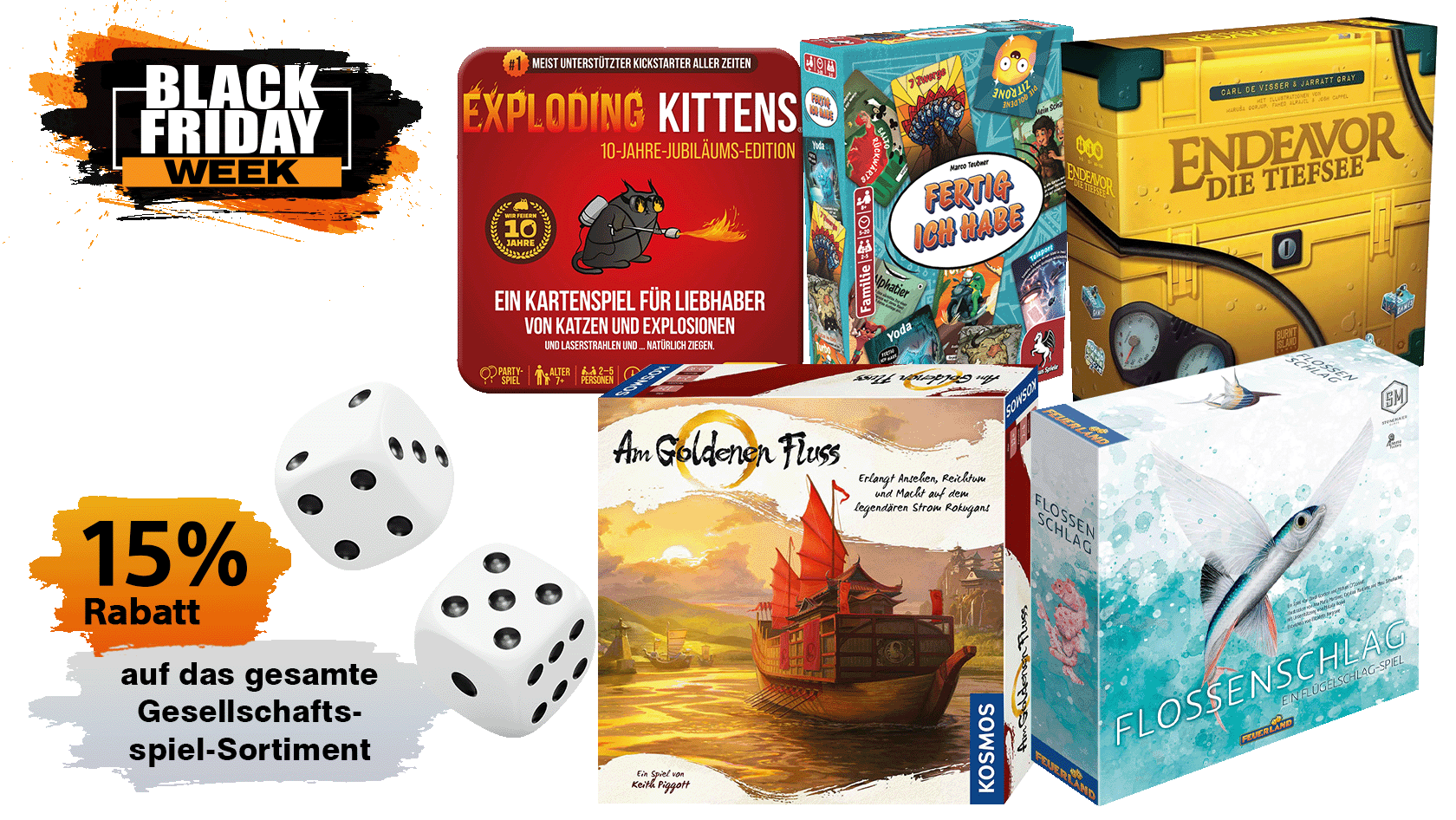 Erhalte 15% Rabatt auf alle Gesellschaftsspiele. Entdecke neue Familien- und Partyspiele, sichere dir Brettspiel-Klassiker oder die kniffligsten Kennerspiele.
