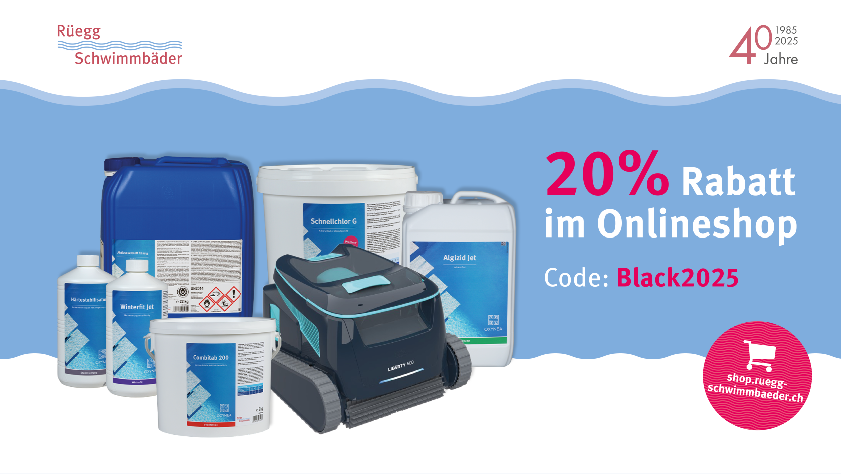 Mit dem Code Black2025 jetzt 20% Rabatt auf Wasserpflegemittel, Poolroboter & Zubehör im Rüegg Onlineshop sparen! 24. Nov. – 01. Dez. 2025