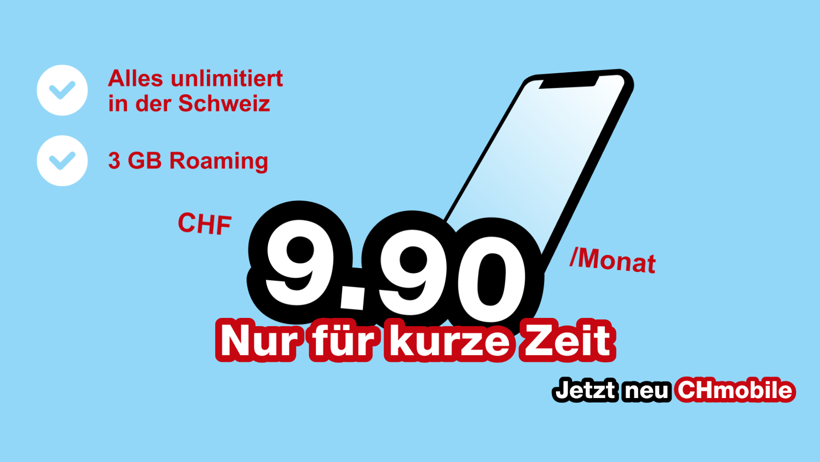 CHmobile ist da! Unlimitiertes Internet, SMS & Anrufe in der Schweiz + 3 GB Roaming – nur CHF 9.90/Monat, keine Aktivierungsgebühr!