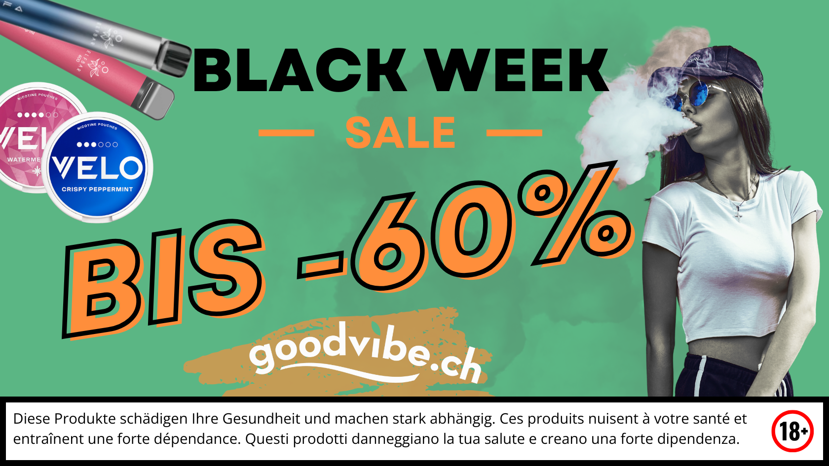 goodvibe.ch Black Week! Spare bis zu 60 % auf E-Zigaretten, CBD, Snus, Tabak.