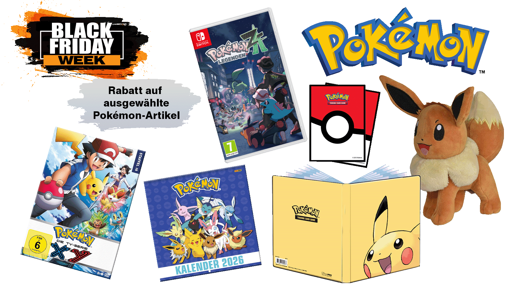 Entdecke die vielfältige Welt der Pokémon und profitiere von Black Friday-Preisen auf Pokémon Games, Bücher, Anime, TCG-Artikel und Merchandise.