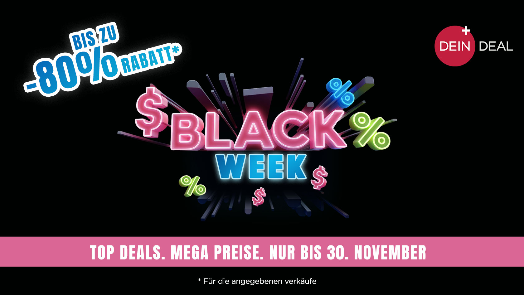 Black Week bei DeinDeal: Bis zu –80% auf Fashion, Beauty, Home, Reisen & mehr. Top-Deals zu Mega-Preisen – nur bis 30.11. & solange Vorrat reicht.