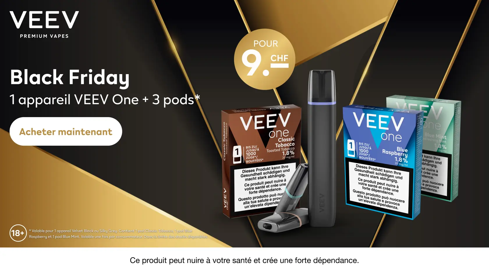 VEEV Black Friday: 1 appareil VEEV One + 3 pods* pour CHF 9.-. Choisissez entre 1 appareil Velvet Black ou Silky Grey.