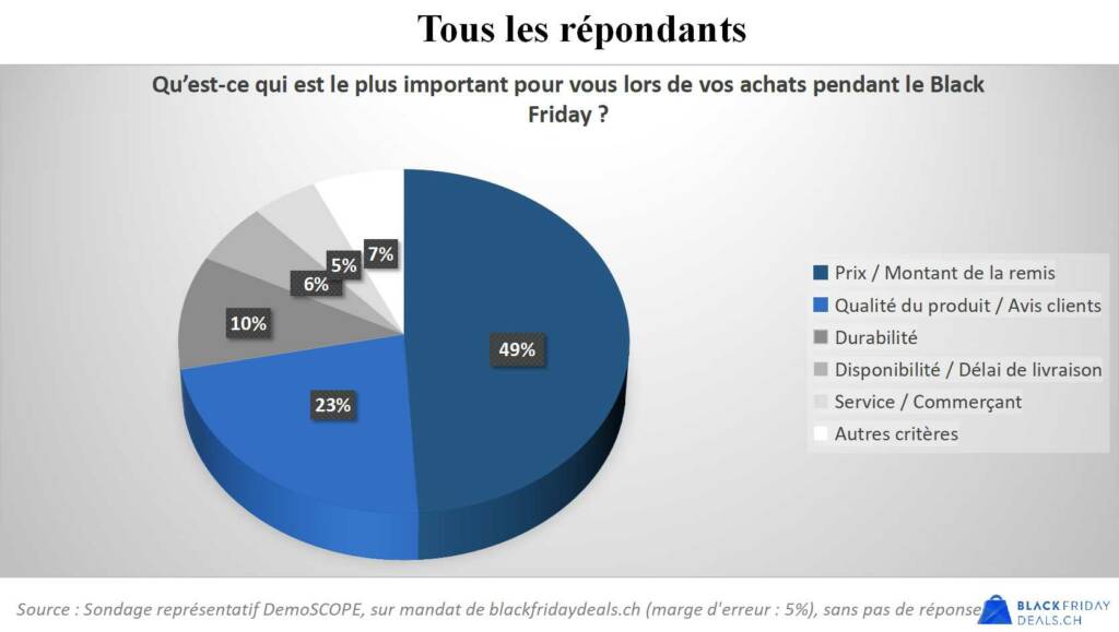 Un sondage de 2023 montre que la proportion de Suisses utilisant le Black Friday pour acheter des cadeaux de Noël stagne à environ un tiers (36%). La majorité (54%) achète pour elle-même.
