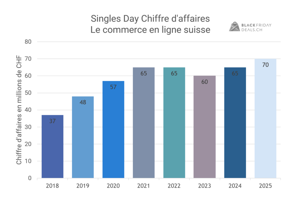 En Suisse, le Singles Day 2025 a généré environ 70 millions de CHF de chiffre d’affaires en ligne, soit un peu plus que l’année précédente (65 millions de CHF).