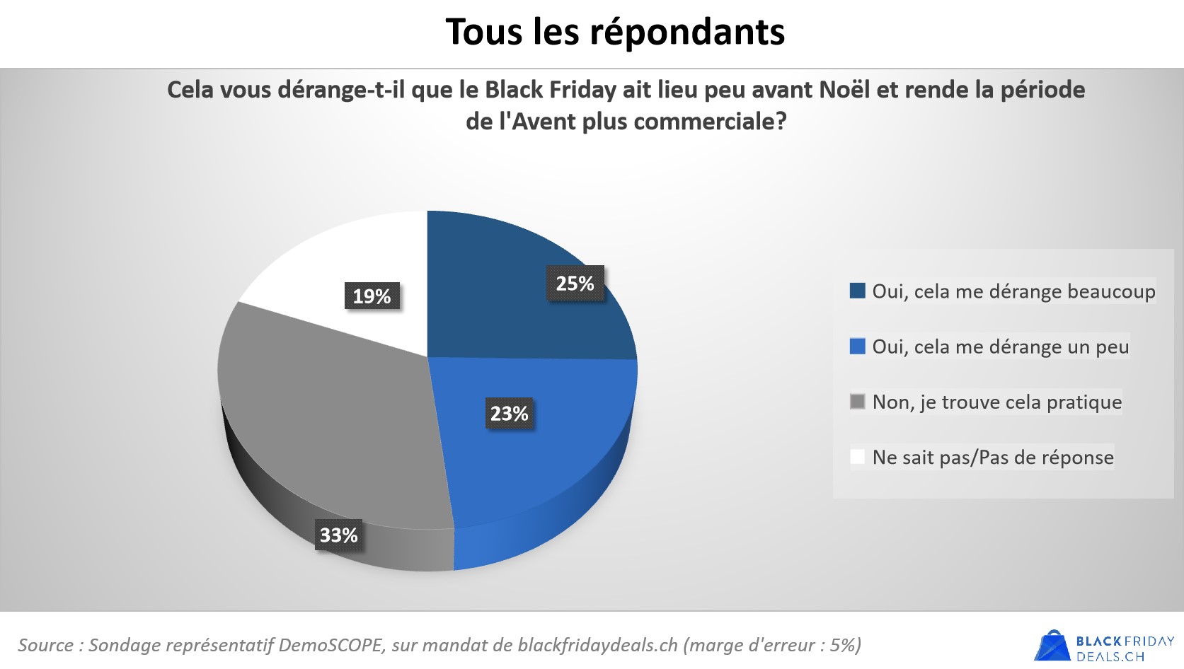 D’après un sondage représentatif réalisé par DemoSCOPE en 2019, 97 % de la population suisse déclare connaître le Black Friday. Malgré cette notoriété très élevée, seule une minorité effectue effectivement des achats ce jour-là. Selon un autre sondage DemoSCOPE de 2021, à peine 16 % des participants affirment avoir profité du Black Friday l’année précédente. Chez les 15-34 ans, cette proportion est de 28 %, alors qu’elle tombe à 7 % chez les 55-74 ans.