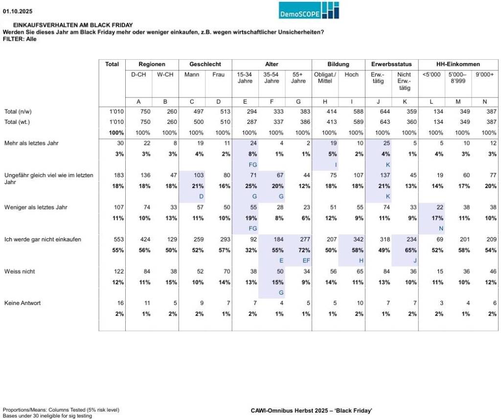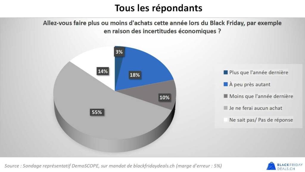 En parallèle, il ne faudrait pas occulter le fait que l’incertitude économique est actuellement très élevée. Ainsi, notre sondage représentatif montre-t-il que seules 3 % des Suissesses et des Suisses prévoient d’acheter davantage lors du Black Friday cette année par rapport à l’an dernier. À l’inverse, 11 % prévoient de réduire leurs achats alors que la majorité des personnes interrogées n’a pas l’intention de faire des achats au Black Friday.