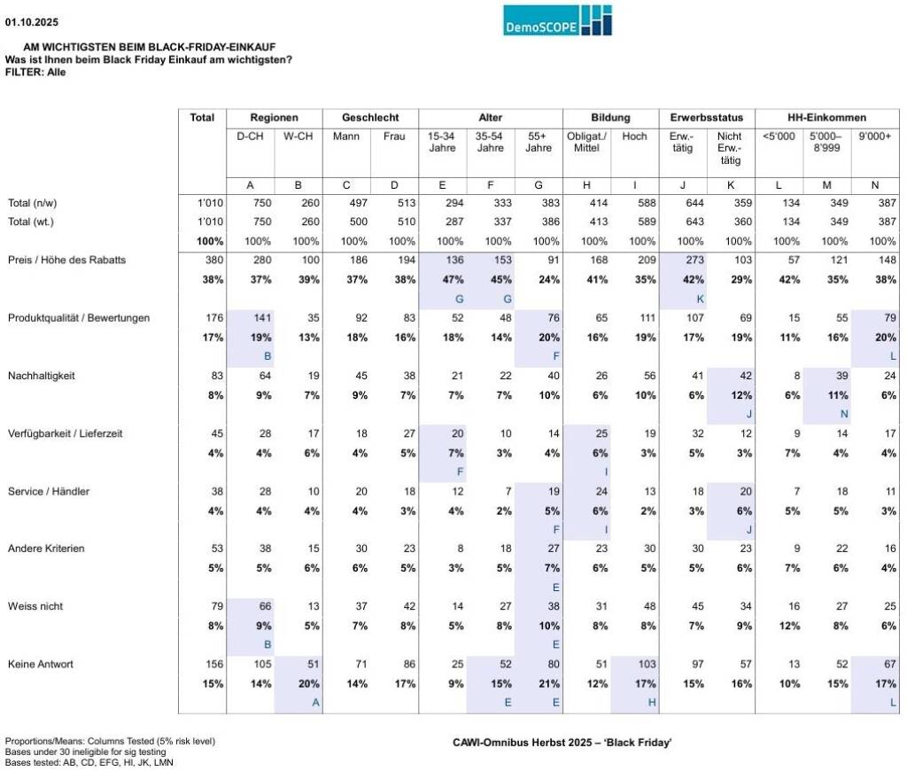 Sans conteste, le critère d’achat le plus déterminant, voire le plus décisif lors du Black Friday reste le prix. En effet, la moitié de la population suisse ou presque, place la valeur du rabais au centre de l’acte d’achat. C’est ce que dévoile un sondage représentatif mené par DemoSCOPE au profit de blackfridaydeals.ch. Un autre quart des personnes interrogées privilégie la qualité du produit ou les évaluations qu’ils considèrent comme le critère fondamental et incontournable lors de leurs achats au Black Friday. Seules quelques personnes estiment qu’il y a d’autres aspects à prendre en priorité – comme la durabilité ou le service du commerçant. Il est frappant de constater que les jeunes privilégient davantage le prix, tandis que les personnes plus âgées accordent plus d’importance à la qualité et à la durabilité.