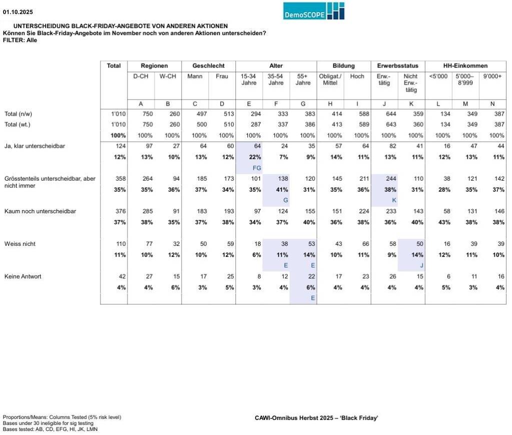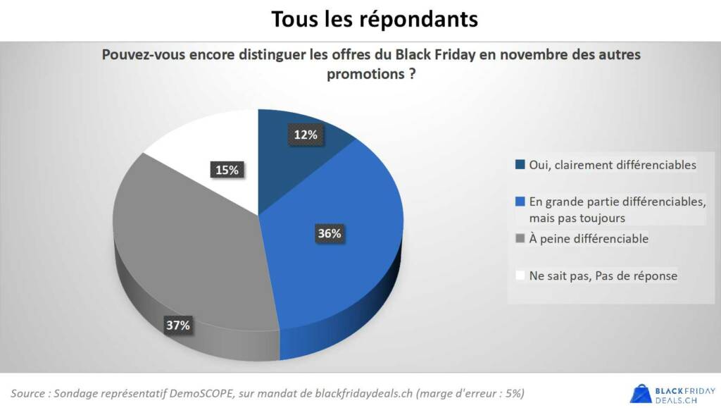 Le même sondage lève le voile sur une autre réalité assez surprenante : en effet, il s’avère que seules 12 % des Suissesses et des Suisses arrivent encore à distinguer clairement les rabais du Black Friday des autres promotions. Un tiers réussit encore à différencier en partie les actions du Black Friday des rabais habituels.