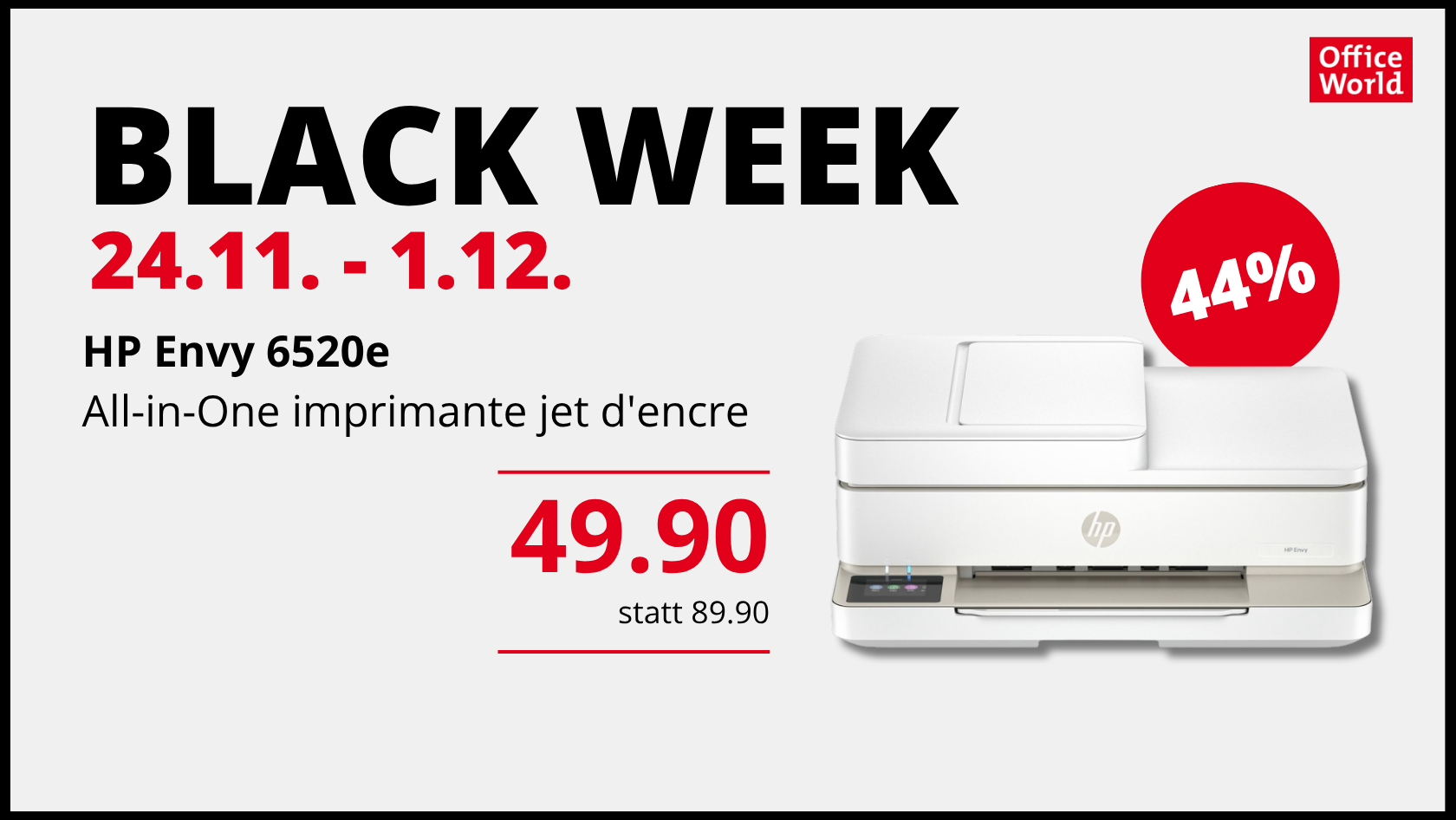 Profite de l’offre HP Envy 6520e pour seulement 49.90 au lieu de 89.90. Une offre parmi tant d’autres lors de notre Black Week, du 24.11 au 1.12.