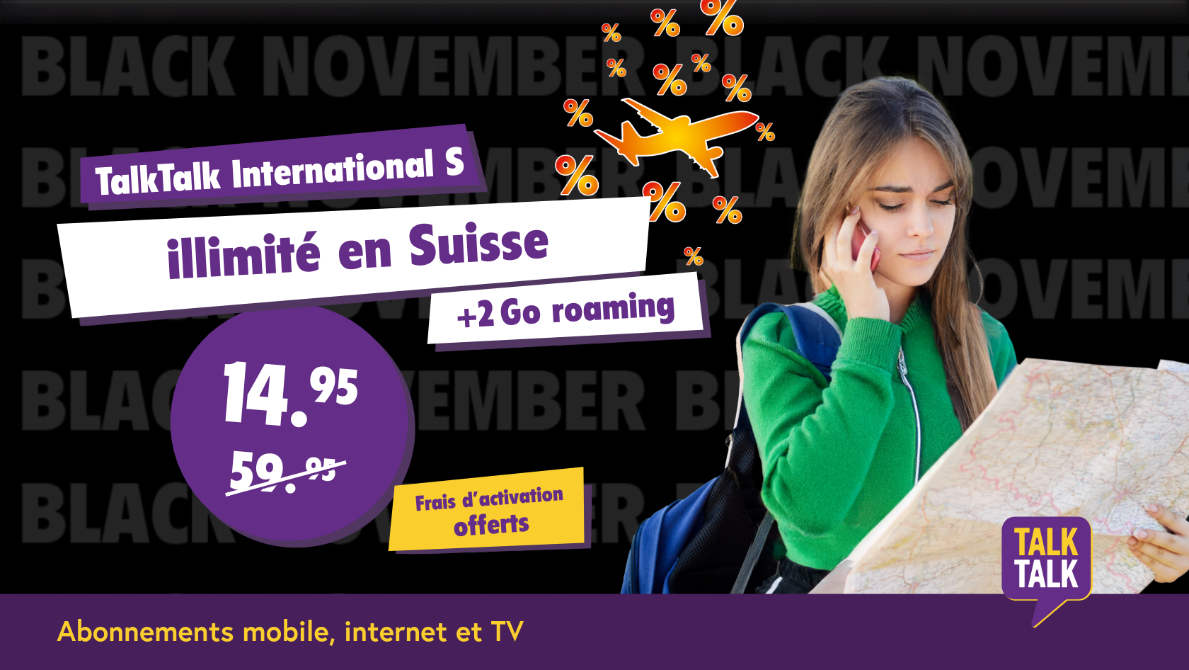 Obtiens l’abonnement TalkTalk International S : Surf & appels illimités en Suisse + 2 Go roaming & 100 min vers l’étranger pour 14.95.-, activation gratuite!