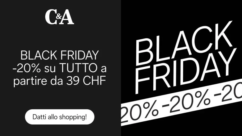 Per il Black Friday potete approfittare del 20% di sconto su tutto l’assortimento C&A a partire da un valore d’ordine di 39 franchi.