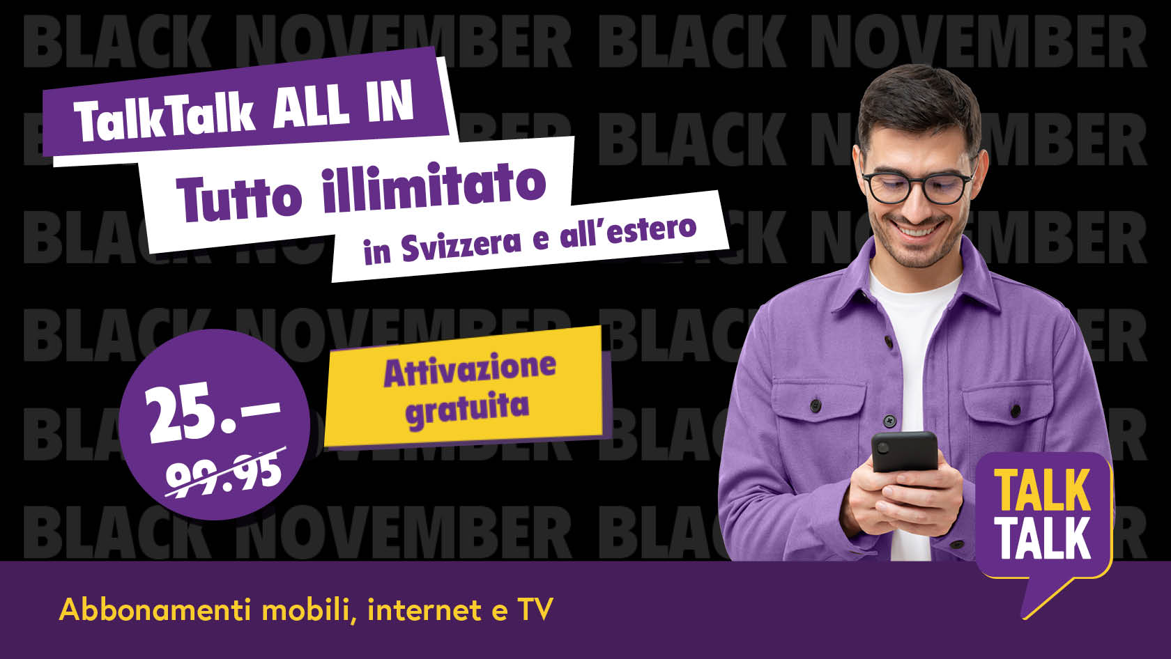 Attiva ora l’abbonamento TalkTalk ALL IN a soli CHF 25.- al mese. Naviga e chiama senza limiti in Svizzera e all’estero – attivazione gratuita inclusa.