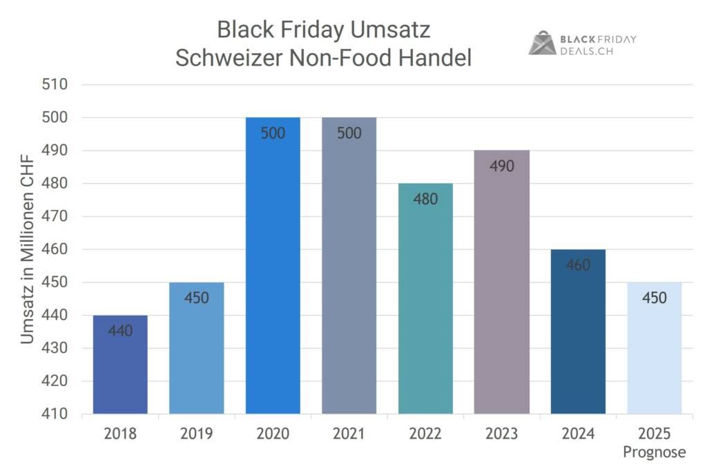 Für den kommenden Black Friday 2025 rechnet blackfridaydeals.ch mit einem Gesamtumsatz von rund 450 Millionen Franken im Schweizer Non-Food Detailhandel. Damit ergibt sich ein leichter Umsatzrückgang um 10 Millionen Franken gegenüber dem Vorjahr.